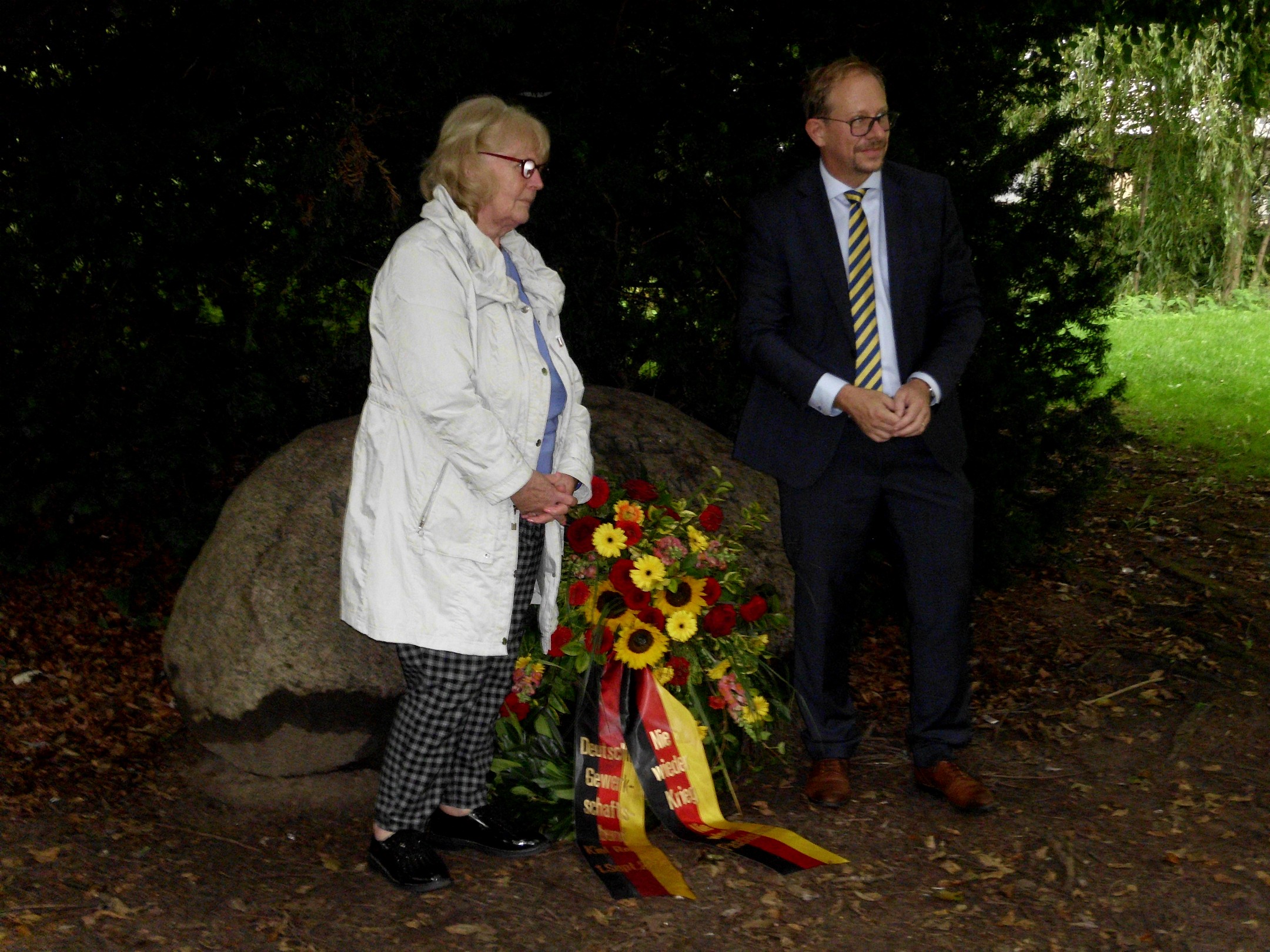Schon um 15:30 Uhr legen GewerkschafterInnen einen Kranz am Gedenkstein in Rencks Park nieder.