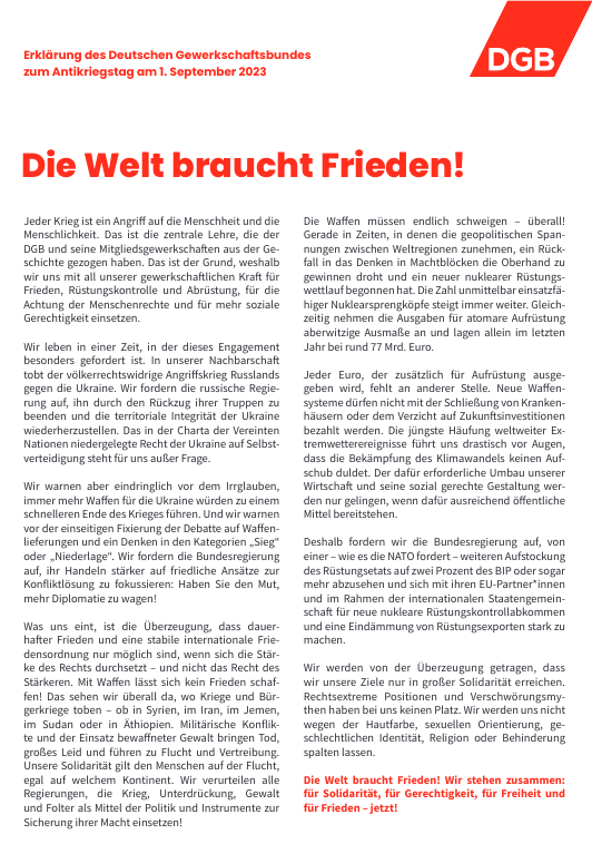 Informationen zur Geschichte des Antikriegstages sowie der aktuelle DGB-Aufruf finden sich