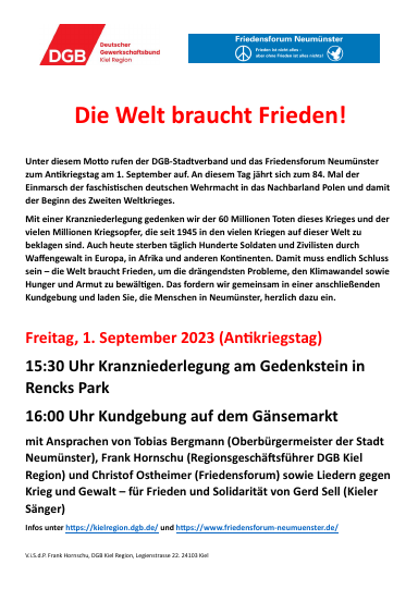 Schon seit vielen Jahren unterstützt das Friedensforum Neumünster Aktionen zum Antikriegstag am 1. September (zur Geschichte des Tages) . Die Friedensbewegung ist heterogen. Es werden verschiedene Standpunkte zum Thema Friedensarbeit vertreten. Wir sind offen für alle Aktionen, die den Frieden fördern und grenzen niemanden aus, der sich für Völkerverständigung und Zusammenarbeit einsetzt. Das heißt nicht, daß wir alle Standpunkte teilen und alle Initiativen mitmachen. Wir entscheiden entsprechend des aktuellen Anlasses.